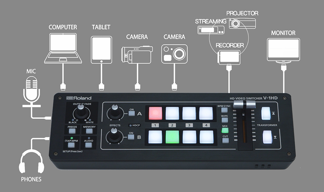 『V-1HD』は、専門知識や高価な業務用機器がなくても、簡単に複数の高画質映像をリアルタイムに切り替えることができ、ライブやイベントの演出だけでなく、投稿や配信用の動画コンテンツの制作にも活用できるビデオミキサーです。